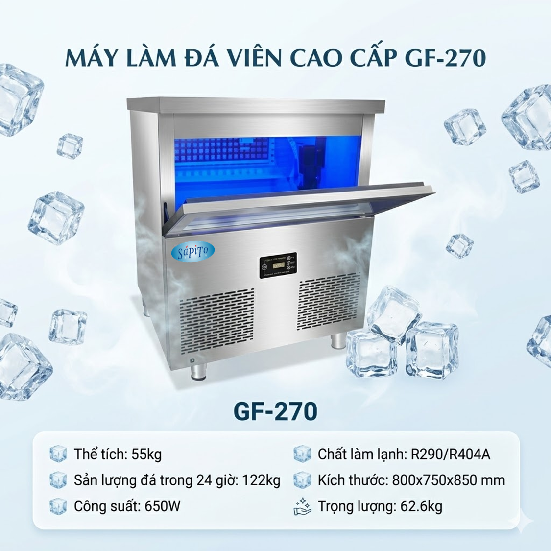 Trong bối cảnh nhu cầu sử dụng đá viên ngày càng tăng cao, đặc biệt trong ngành dịch vụ ăn uống và giải khát, việc sở hữu một chiếc máy làm đá viên chất lượng trở nên vô cùng quan trọng. Máy làm đá viên Sápito GF-270 là một trong những lựa chọn hàng đầu hiện nay, được đánh giá cao về hiệu suất, độ bền và khả năng đáp ứng nhu cầu sử dụng lớn. Bài viết này sẽ cung cấp một đánh giá chi tiết về máy làm đá viên Sápito GF-270, từ thông số kỹ thuật, thiết kế, ưu điểm nổi bật đến hướng dẫn sử dụng và bảo trì, giúp bạn có cái nhìn toàn diện và đưa ra quyết định mua hàng sáng suốt.