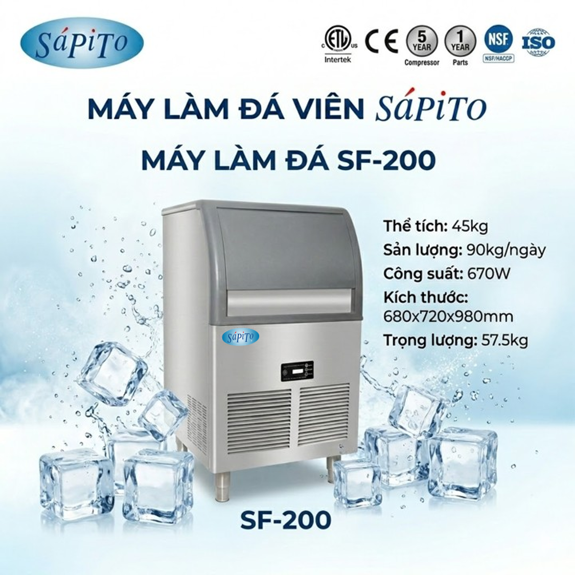 Thông số kỹ thuật chi tiết của máy làm đá viên Sápito SF-200